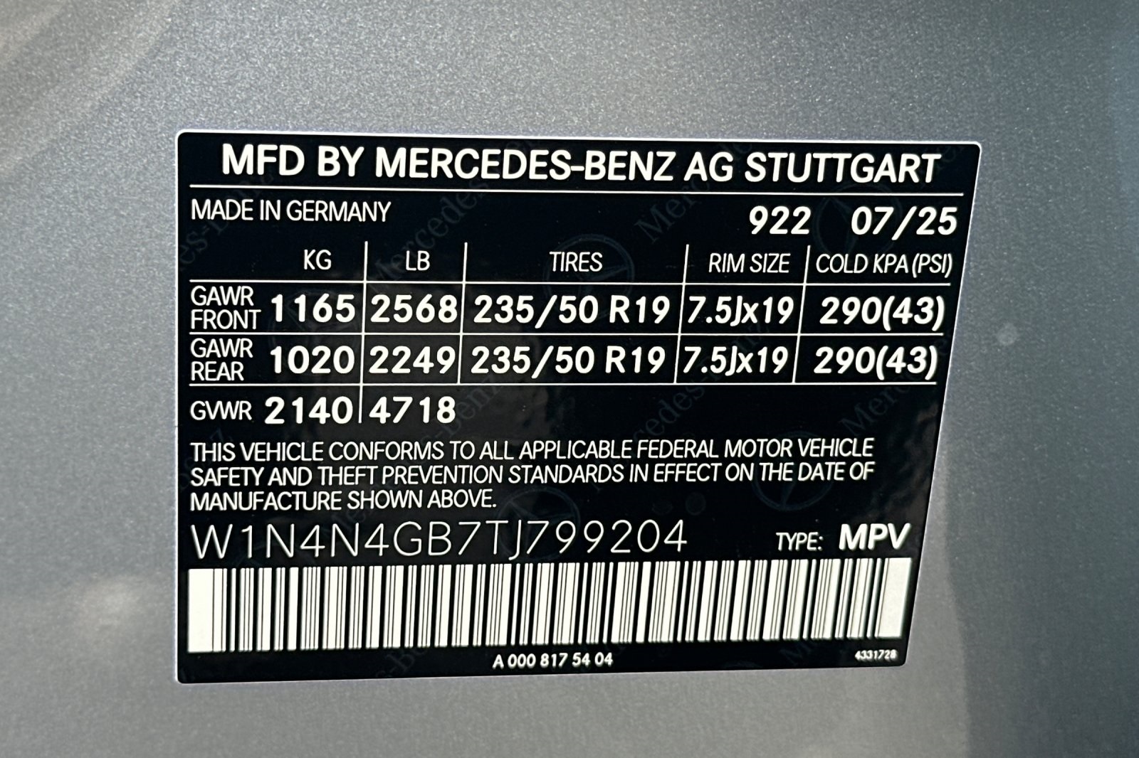 - VIN : W1N4N4GB7TJ799204